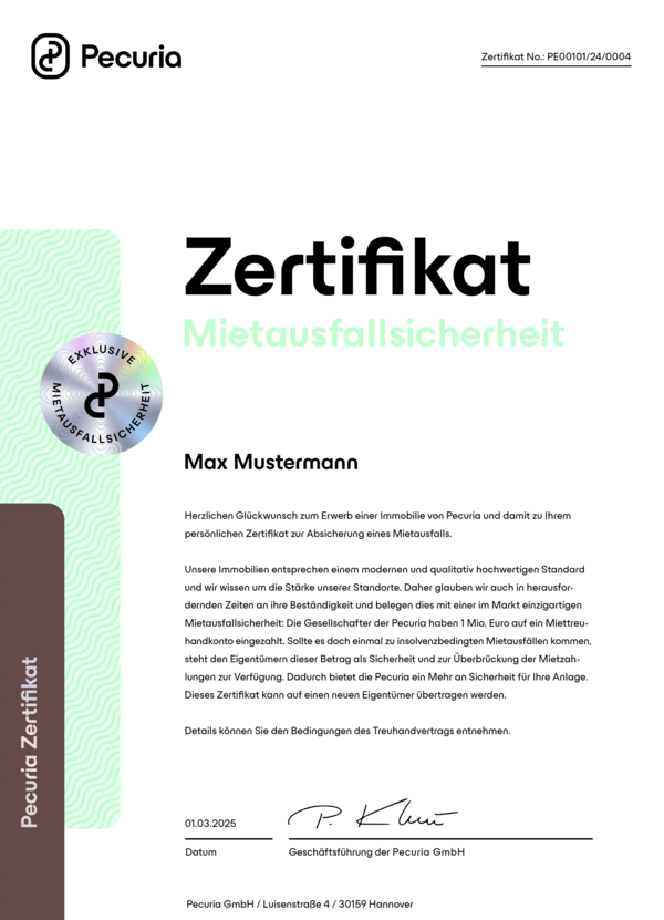 Unsere Immobilien entsprechen einem modern und qualitativ hochwertigen Standard und wir wissen um die Stärke unserer Standorte. Daher glauben wir auch in herausfordernden Zeiten an ihre Beständigkeit und belegen dies mit einer im Markt einzigartigen Mietausfallsicherheit: die Gesellschafter der Pecuria haben 1.0 Mio. Euro auf ein Miettreuhandkonto eingezahlt. Sollte es doch einmal zu insolvenzbedingten Mietausfällen kommen, steht den Eigentümern dieser Betrag zur Sicherheit und Überbrückung der Mietzahlungen zur Verfügung. Somit bietet die Mietsicherheit der Pecuria ein Mehr für Ihre Anlage.