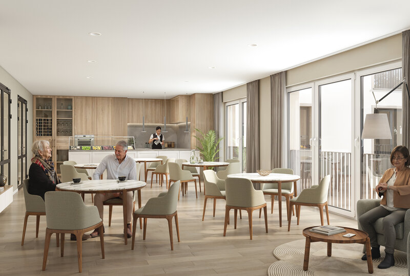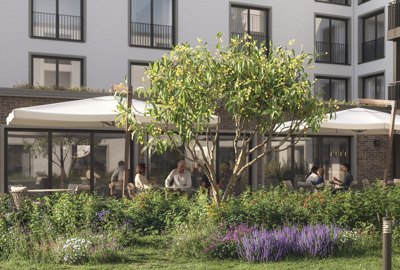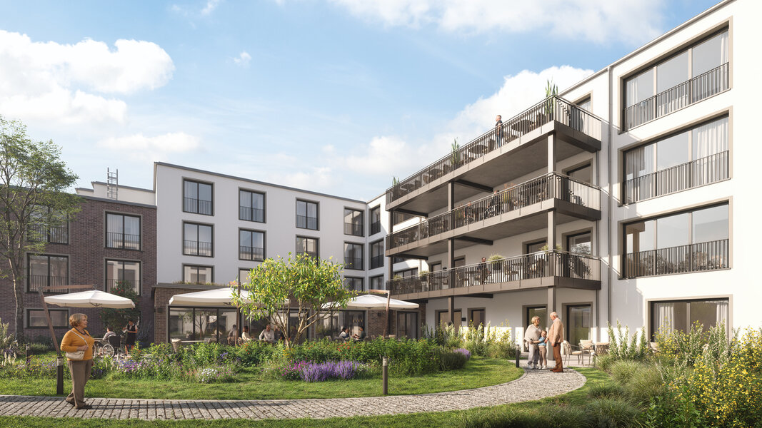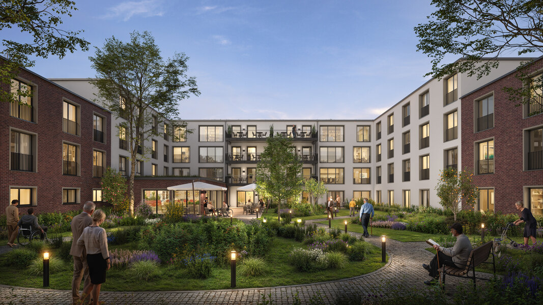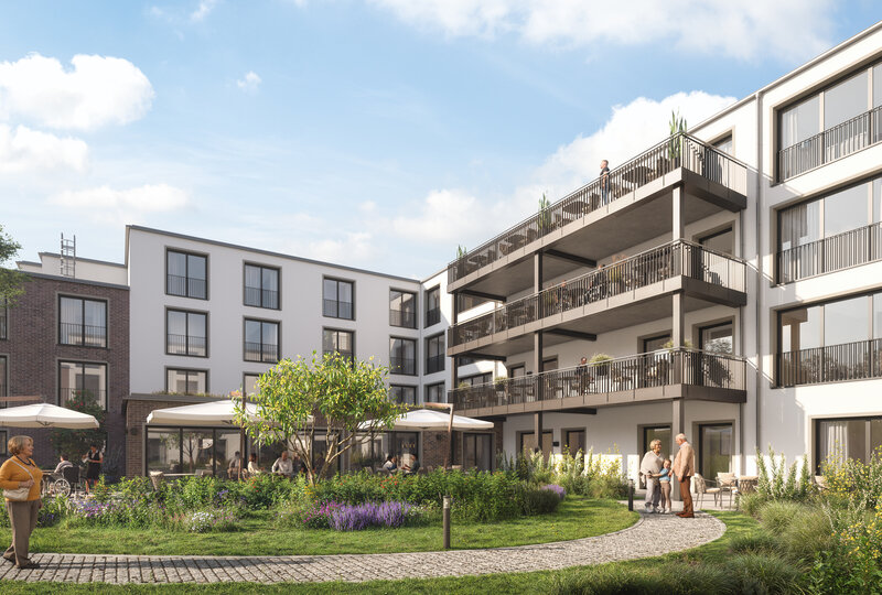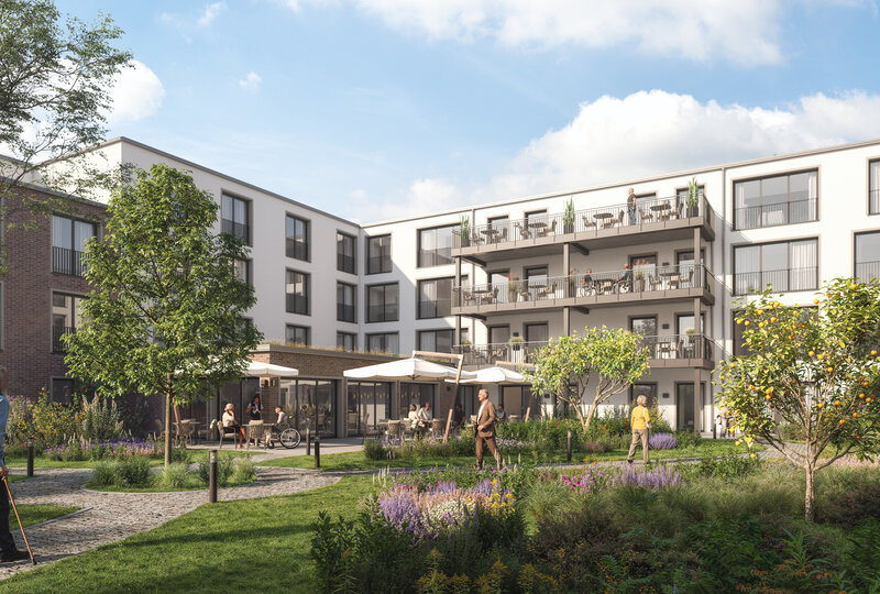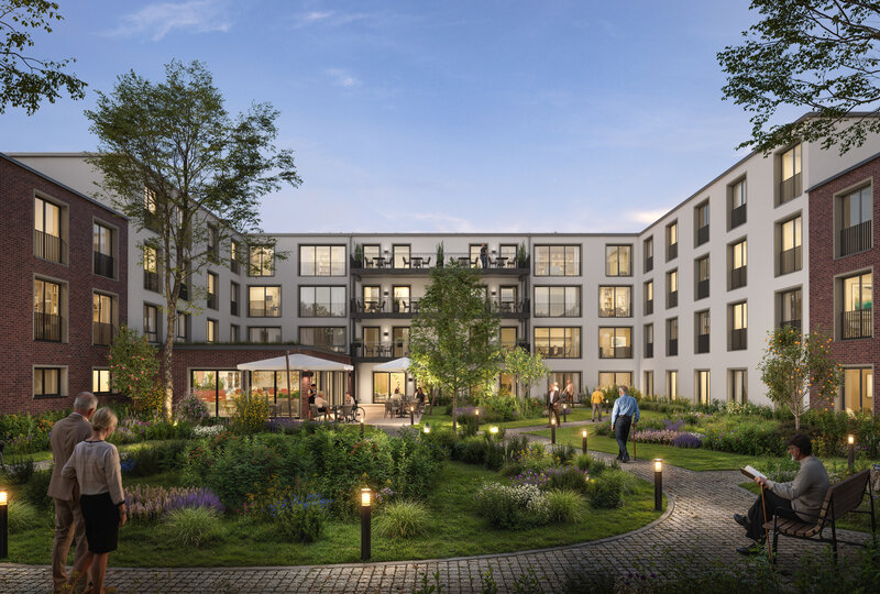 Im nördlichen Teil des Grundstückes entsteht das u-förmige Hauptgebäude als moderne Seniorenresidenz mit umfangreichem Serviceangebot. Sie wird über rund 6.900 Quadratmeter Wohn- und Nutzfläche verfügen. Neben einem hotelähnlichen Empfang mit freundlich gestalteter Lobby sind auch eine Kaminlounge mit Bibliothek, ein Friseur, ein Pflegebad sowie ein Restaurant mit Sonnenterrasse für die Bewohner geplant. Diese Angebote können ebenso von den Bewohnern der Service-Wohnungen genutzt werden. Von den 143 modernen, barrierefreien Einzelzimmern sind 47 rollstuhlgerecht ausgestattet. Die Residenz ist in sieben Wohngruppen gegliedert, die ein häuslich-familiäres Leben ermöglichen. Jede Wohngruppe verfügt über einen privat-familiär gestalteten Gemeinschaftsraum mit Küchen- und Essbereich als kommunikatives Zentrum, das die sozialen Kontakte der Bewohner fördert.