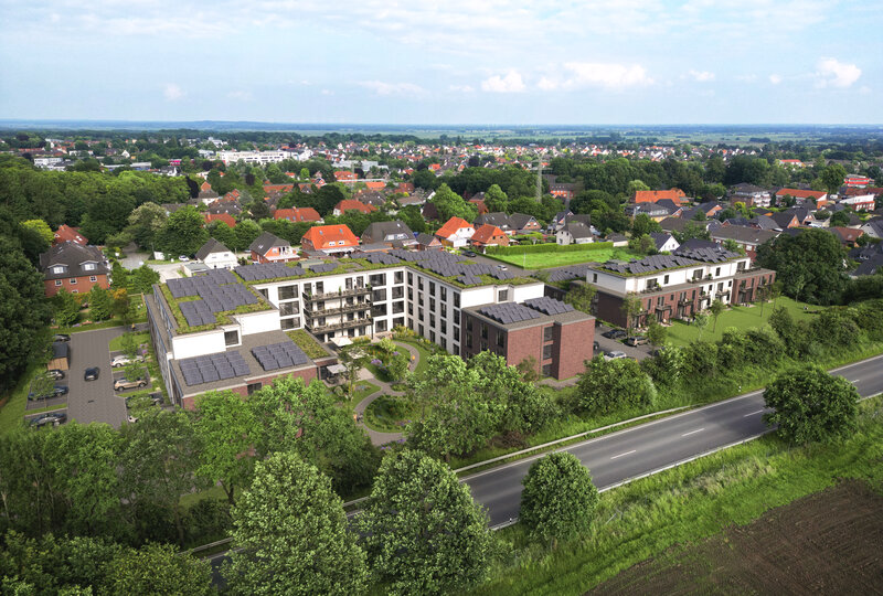 Der zweiteilige Gebäudekomplex entsteht in dreigeschossiger Bauweise mit zusätzlichem Staffelgeschoss und entspricht damit den Vorgaben aus dem im Sommer 2021 für das Gebiet aufgestellten Bebauungsplan. Gebaut wird nach dem energiebewussten KfW-40NH-Standard, der auch die Kriterien der DGNB-Silber-Zertifizierung erfüllt und damit das Qualitätssiegel für hohe Nachhaltigkeit erreicht. Die Flachdächer der Gebäude erhalten eine naturnahe Begrünung. Die Fassaden werden geradlinig und modern gestaltet und gemäß Bebauungsplan in Teilen rot verklinkert. Damit fügen sie sich mit ihrer überwiegend hellen Farbgebung visuell ausgezeichnet in die umliegende Bauung ein. Zum Schallschutz entsteht an der Westgrenze des Grundstücks eine Schutzwand entlang der B74. Die zur Straße gelegenen Fenster werden mit einem erhöhten Schallschutz ausgestattet.